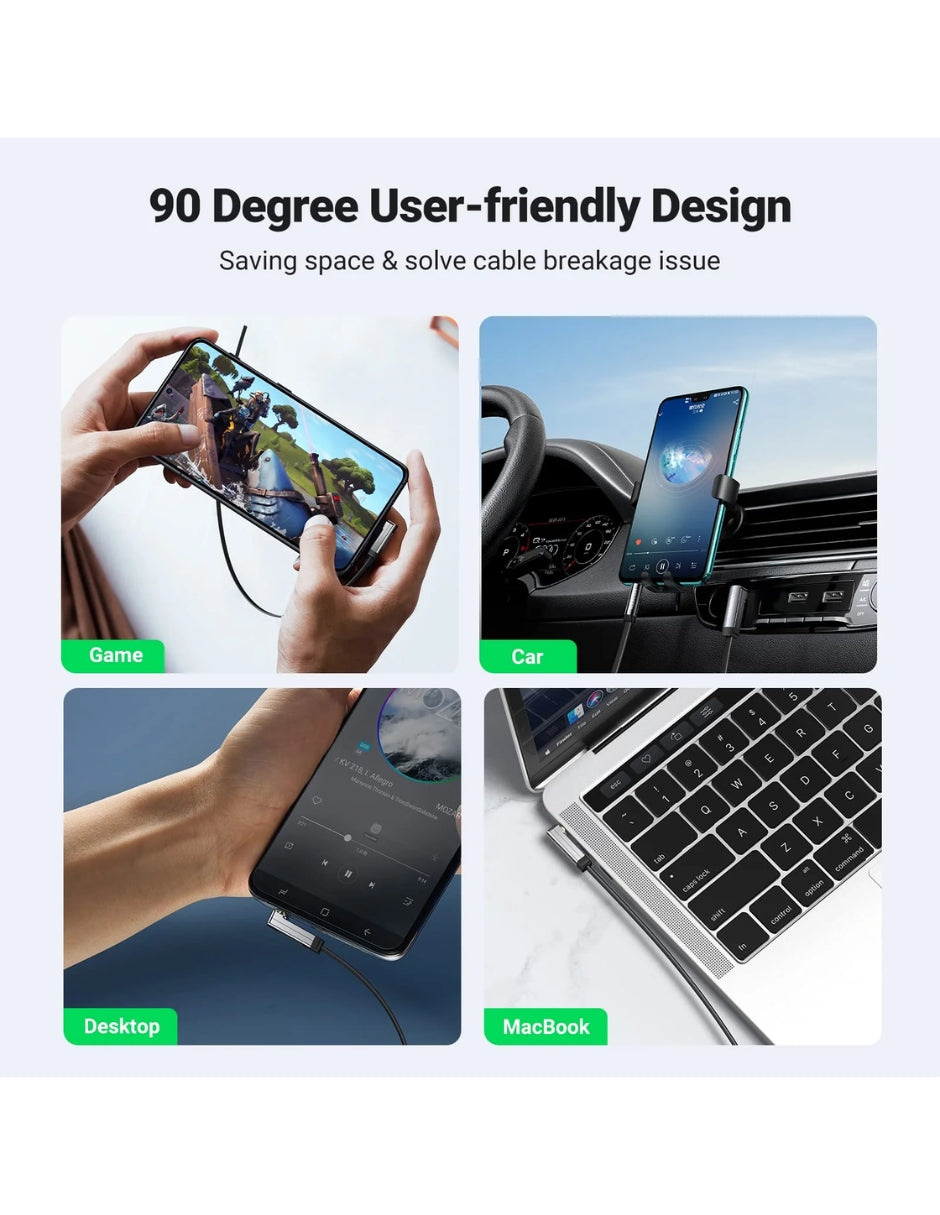 Conector en Ángulo Recto (90°): Ideal para espacios reducidos (como detrás de equipos de música o en el coche) y reduce la tensión en el cable y el puerto del dispositivo.