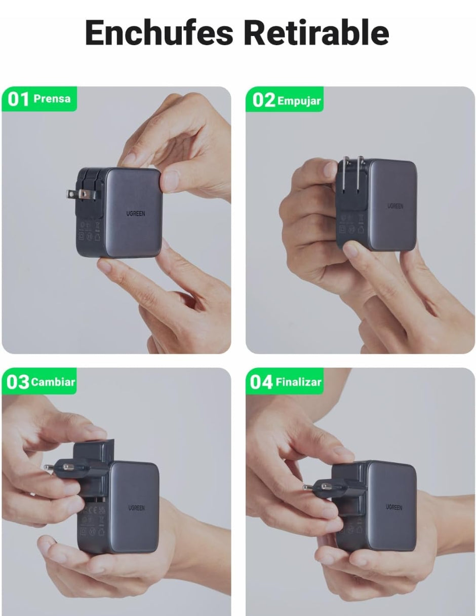 Cargador rápido USB C Nexode de 65 W: el cargador UGREEN Nexode USB C puede entregar hasta 65 W para cargar la mayoría de los dispositivos a máxima velocidad, incluso cargar una MacBook Pro a máxima velocidad del 0% al 100% en solo 1,5 horas. Con 2 puertos USB-C y 1 puerto USB-A, puede cargar simultáneamente una computadora portátil, una mesa o un teléfono.