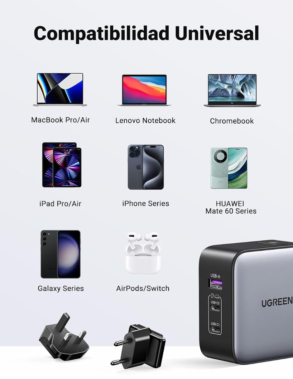 Amplia Compatiblidad: el cargador internacional de 65 W es compatible con casi todos los dispositivos. p.ej. compatible con MacBook Air de 13 pulgadas M2 2022, MacBook Air M1 de 13 pulgadas 2020, portátiles XPS, Surface Pro 8/ 7/ 6; iPad Pro 6 M2, iPad Pro/Air, iPhone 14 Pro, 14 Pro Max, 13 Pro Max, 12, 11; Galaxy S23 S2 Ultra, S22, S2, S21 Ultra, S21, S 10, A53, A52; Steam Deck, Switch, AirPods, Watch Ultra, Watch 8/7, etc.