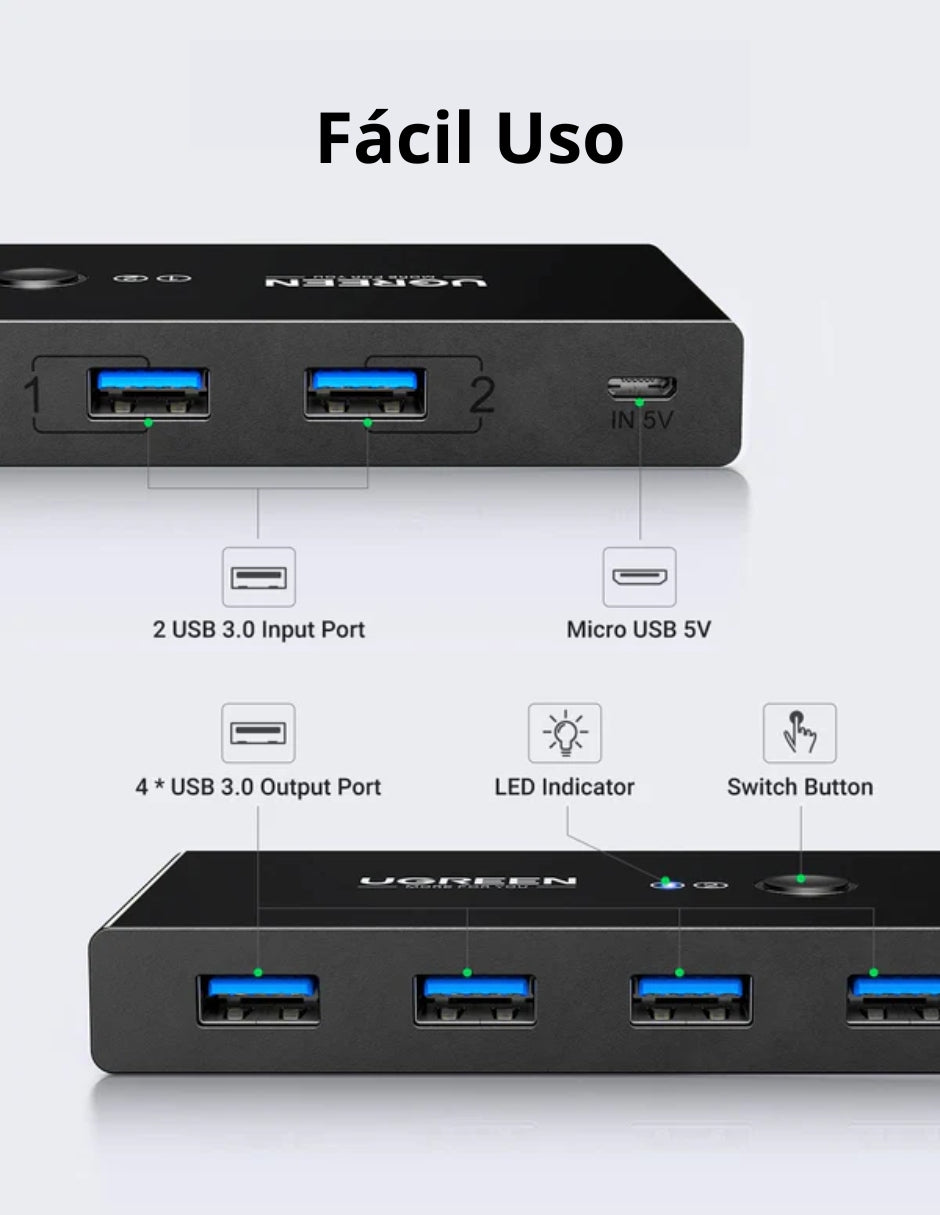 Permite que hasta 2 usuarios compartan 4 dispositivos periféricos USB 3.0, como impresora, escáner, ratón, teclado, disco USB, etc.