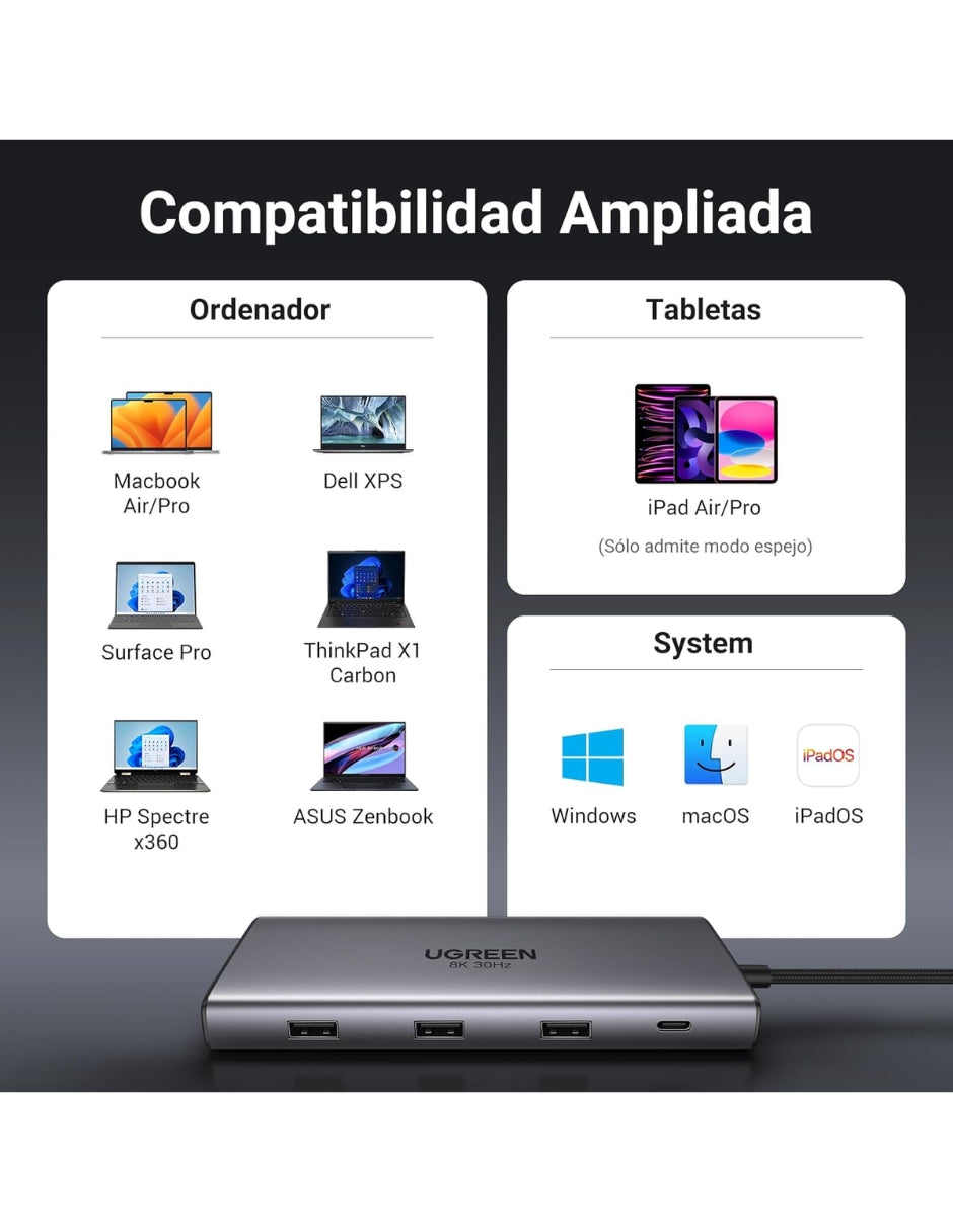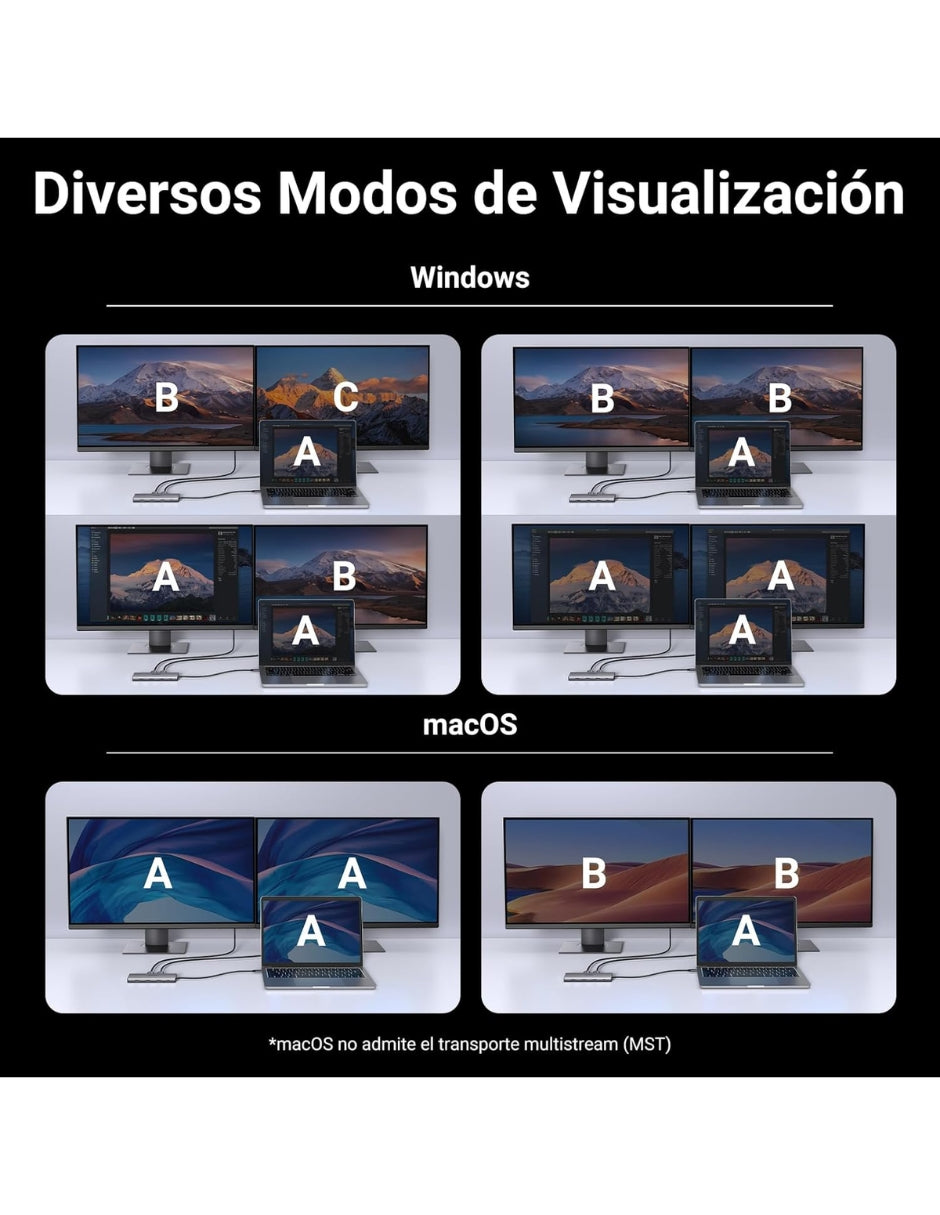 Soporte de Video Ultra HD: Conecta un monitor con resolución 8K@30Hz (solo Windows) o configura monitores duales 4K@60Hz simultáneamente para una productividad sin igual.