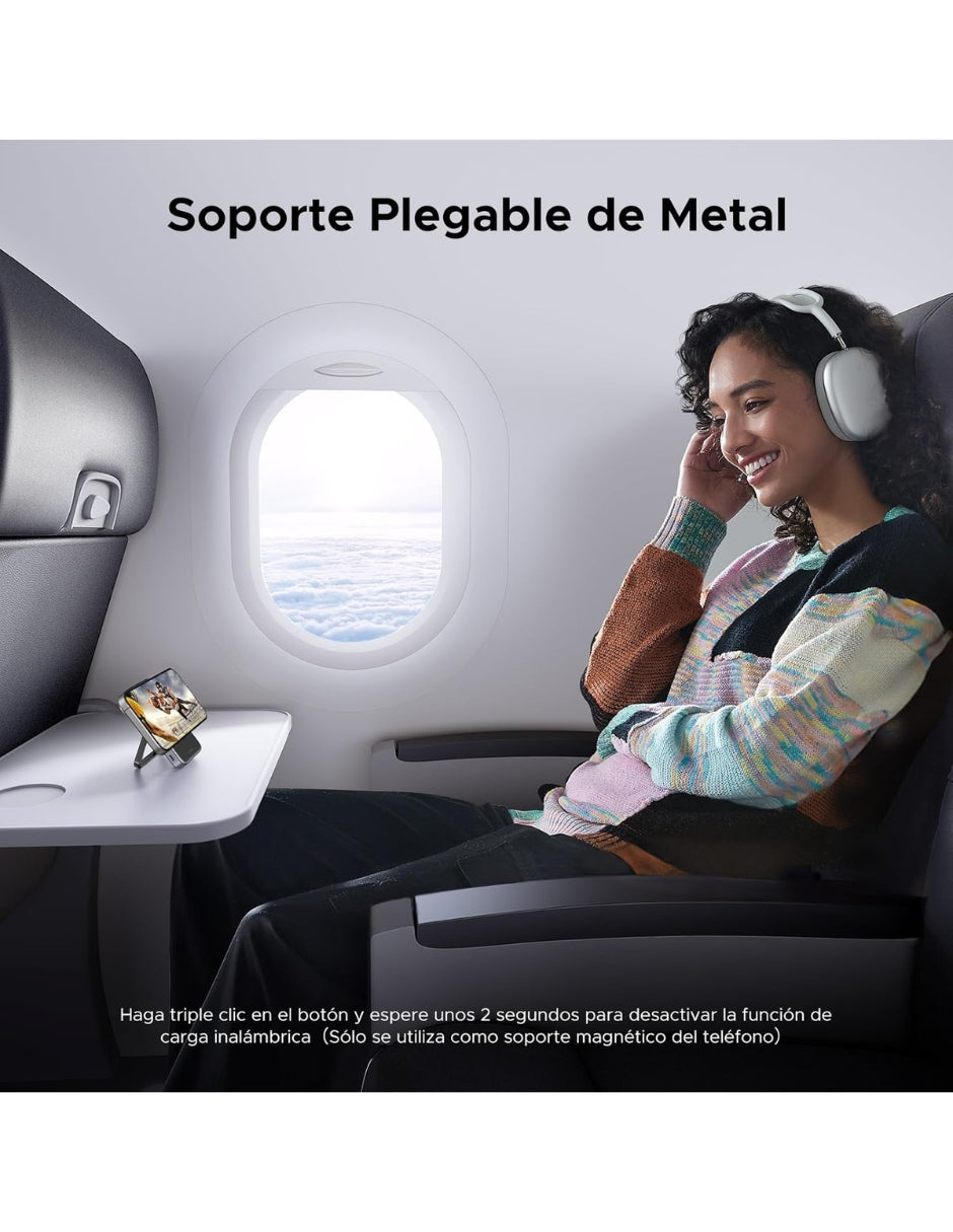 Soporte Plegable: Cargador portátil magsafe tiene 8-10N de fuerza magnética para absorber firmemente y apoyar el teléfono, lo que le permite apoyar mientras se carga el dispositivo, liberando sus manos. Este diseño hace que sea fácil de ver vídeos, video chat